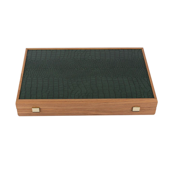 Verbeter je spelavonden met de handgemaakte Premium Leatherette Crocodile Tote Backgammon Set in Groen. Deze luxe set heeft een rijk groen kunstleren speelveld, prachtig gecontrasteerd met mokkakleurige en ivoorkleurige accenten. De buitenkant heeft een prachtige Crocodile Tote-textuur in bijpassend groen, die elegantie en stijl uitstraalt. De set wordt geleverd met 30 schijven (15 bruin en 15 ivoorkleurig), 4 dobbelstenen, een verdubbelingsdobbelsteen en houten dobbelbekers, allemaal elegant gepresenteerd in een Manopoulos-geschenkdoos. Met een gesloten bordformaat van 48 x 26 cm combineert deze backgammonset stijl en functionaliteit, waardoor het een prachtige aanvulling is op elke luxe speelkamer of een perfect cadeau voor veeleisende bordspelliefhebbers.