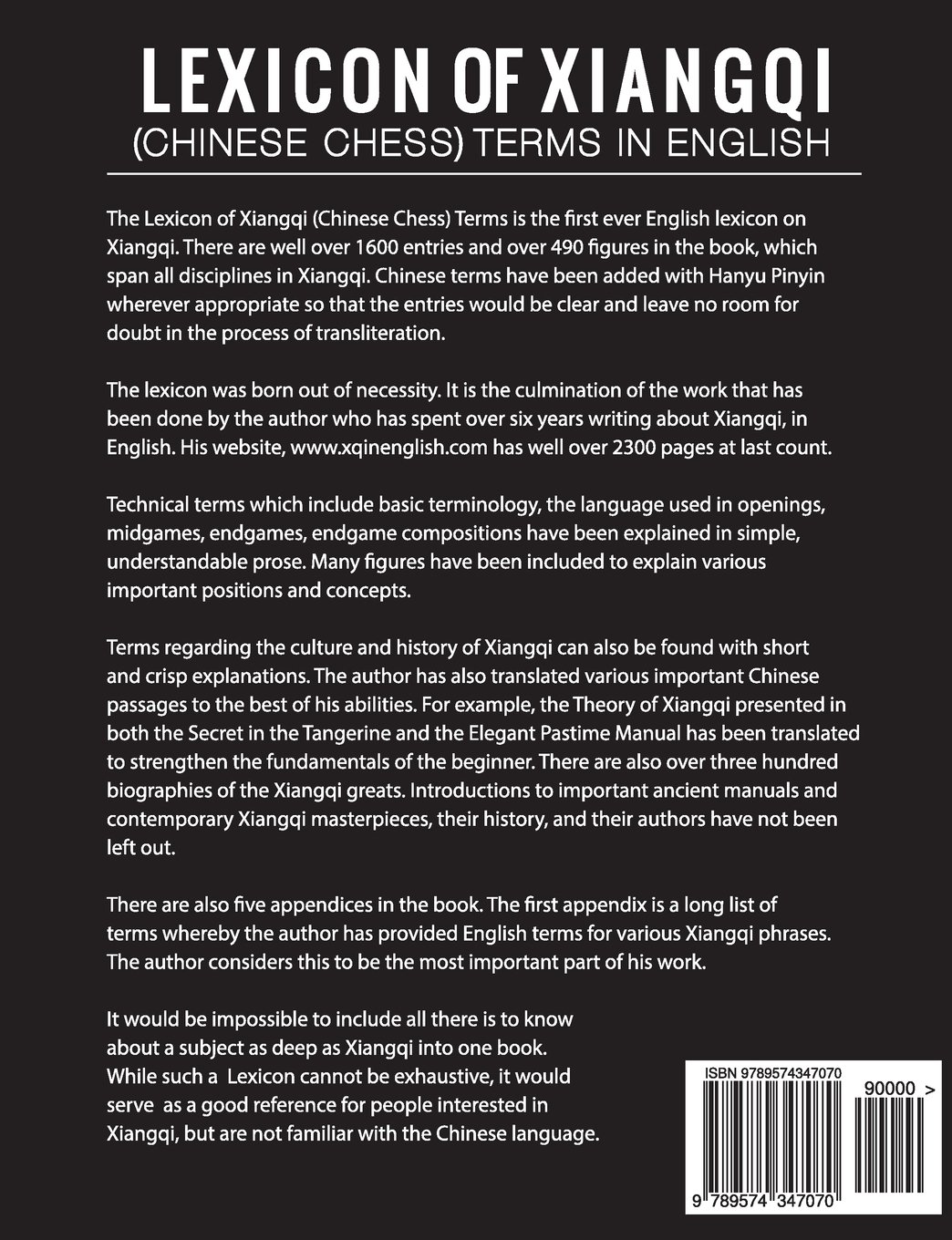 The Lexicon of Xiangqi (Chinese Chess) Terms is the first ever English lexicon on Xiangqi. There are well over 1600 entries and over 490 figures in the book, which span all disciplines in Xiangqi. Chinese terms have been added with Hanyu Pinyin wherever appropriate so that the entries would be clear and leave no room for doubt in the process of transliteration.