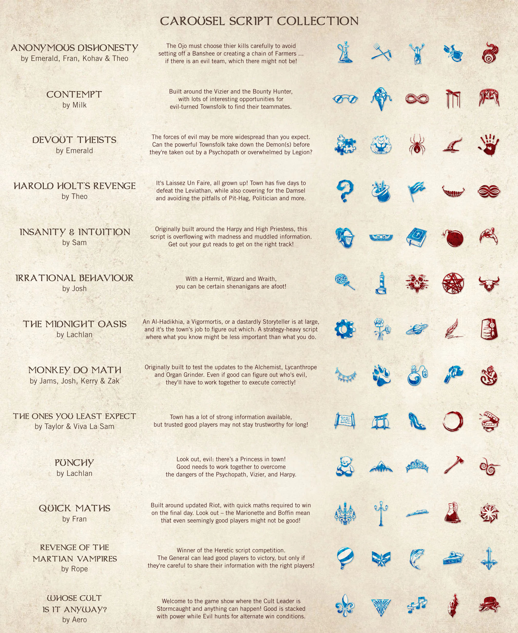 This character pack is designed for those committed to playing BOTC with custom scripts and experimental characters, taking their social deduction gaming experience to the next level.