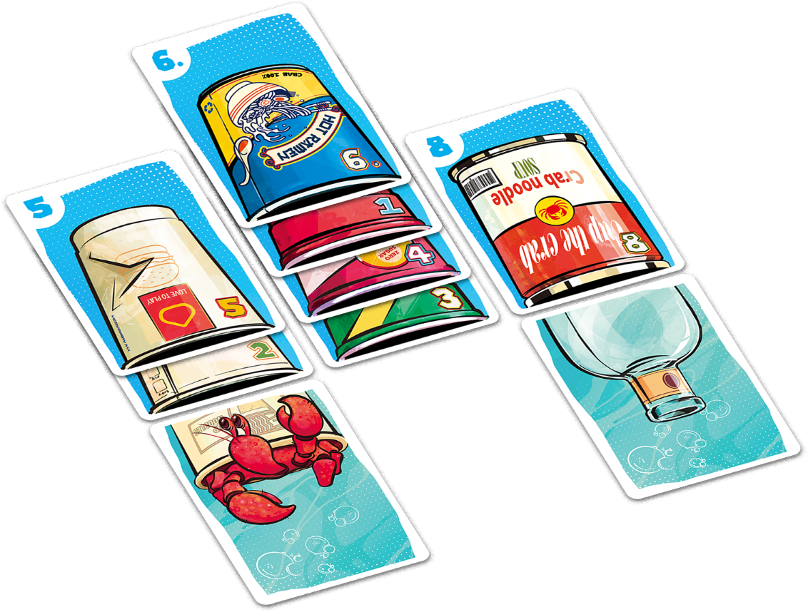 Players work together to build piles of Cup cards, but since victory points are scored from Cup cards, competition is fierce as everyone aims to claim the best piles using their Crab or Octopus cards. Bottle cards introduce an exciting twist, as only Octopus cards can follow them.