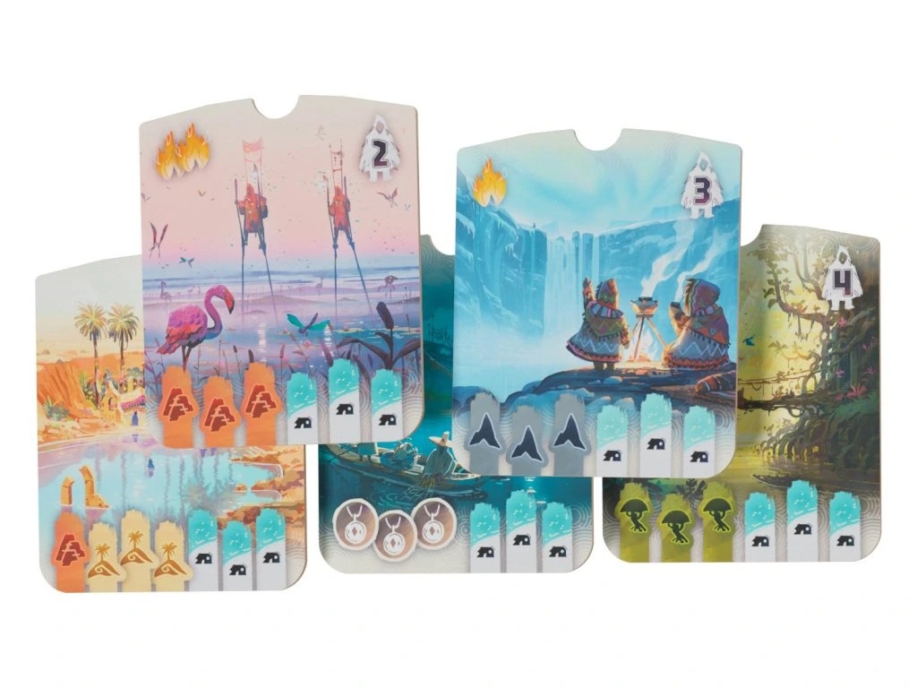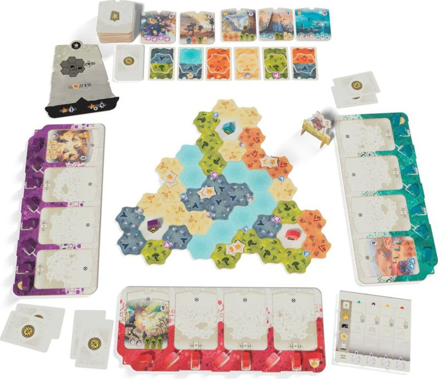 Dewan is a fast-paced and competitive territory placement game for 2-4 players, centering on racing, placement, and hand strategies. During the game, you collect terrain cards and use them to strategically place your camps within the territory. By making smart use of terrain and resources, you can meet the requirements of your story tiles.
