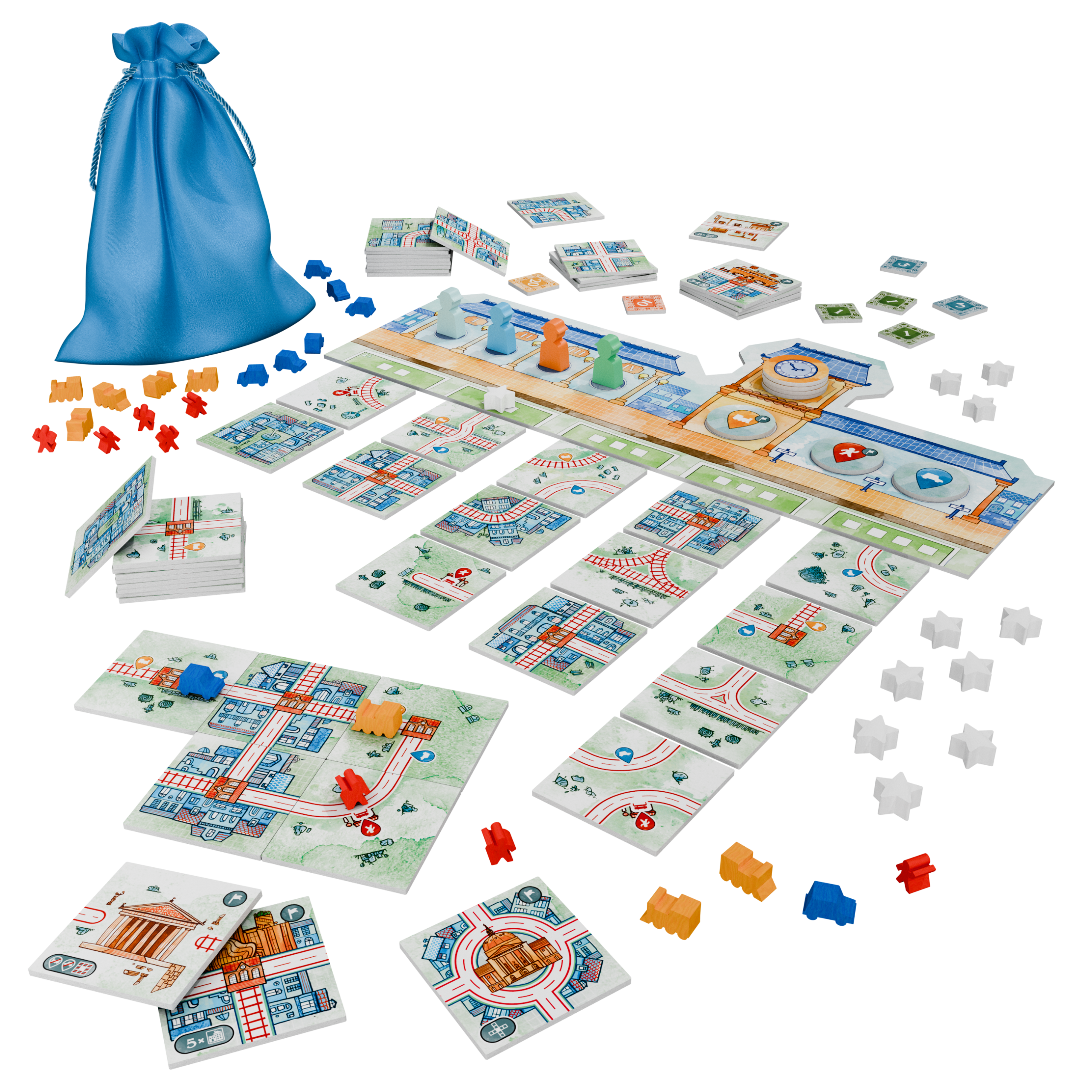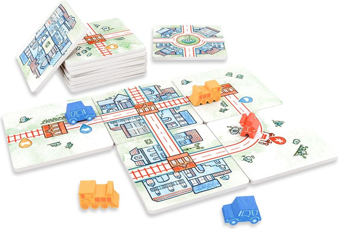 The game is played over eight rounds. You start each round by drafting your tiles from the sets available in the common pool, then you place your routes in front of you, trying to make as many connections as possible; be careful not to lock yourself in with choices that are too constraining. Each round, you can also place cars, trains, or travelers to populate the tiny little landscape you're creating - as long as you have free space on your tiles. The available actions change from round to round, so you need to prepare in advance!