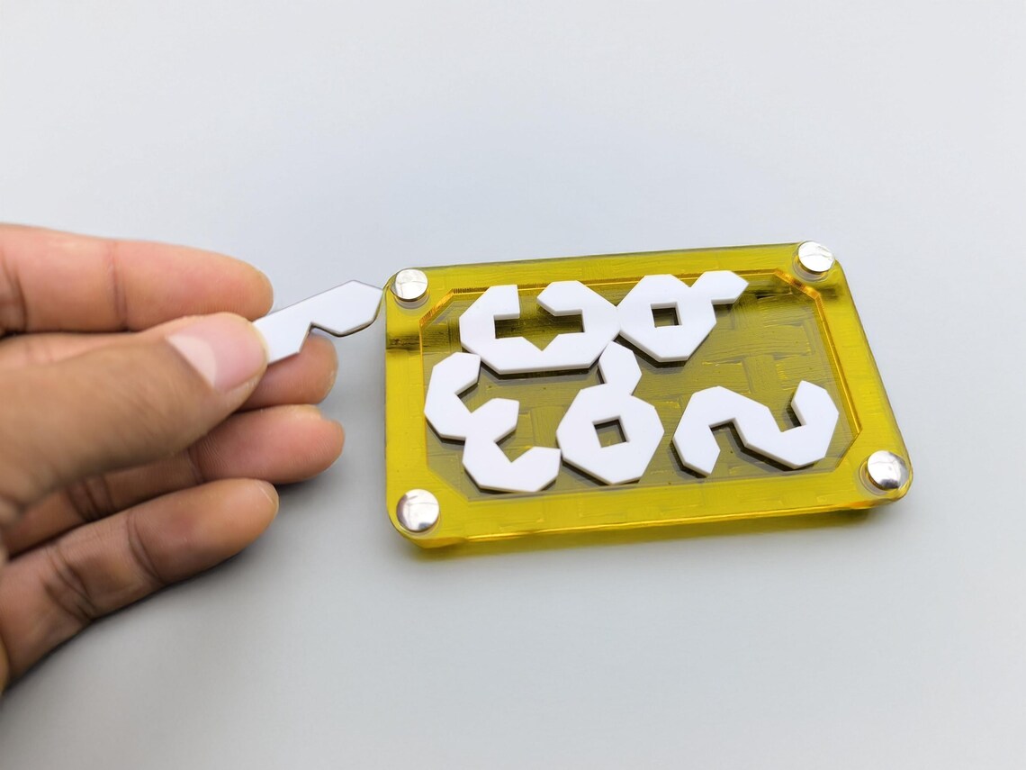 This clever level 8 packing puzzle is designed by Tuan Djeems, the goal is to fit all 10 acrylic pieces flat into the tray without overlaps.