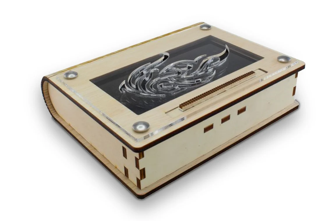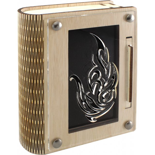 The Book of Fire is een lastige puzzeldoos in de vorm van een boek, gemaakt door Tuan Djeems. Ontwerpen is altijd zijn passie geweest en hij is begonnen met het met de hand maken van zijn eigen puzzeldozen. Deze doos is gemaakt van een combinatie van hout, acryl en multiplex, met een dansende vlam die in het acryl aan de voorkant is uitgesneden. Er zit ook een inkeping in de schuif aan de voorkant van de doos, maar dit lijkt de enige andere aanwijzing te zijn over hoe de doos geopend kan worden...