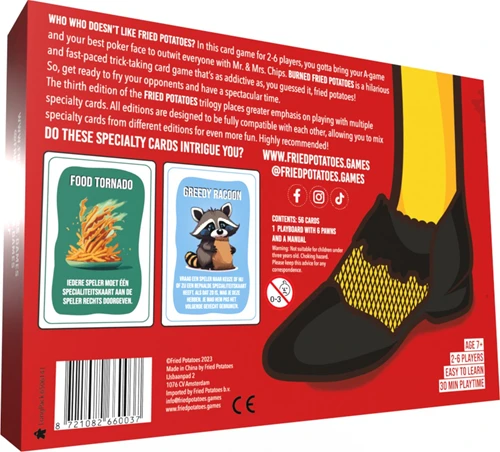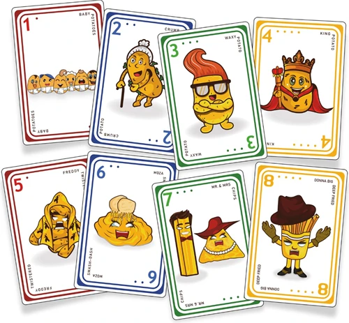 Fried Potatoes is een snel, strategisch kaartspel waarbij elke ronde toewerkt naar één enkele confrontatie met hoge inzetten. Je speelt genummerde aardappelkaarten in vier kleuren en probeert slagen te winnen, maar alleen de laatste slag telt. Win die en je vermijdt strafpunten. Verlies je hem, dan beland je in de frituurpan.