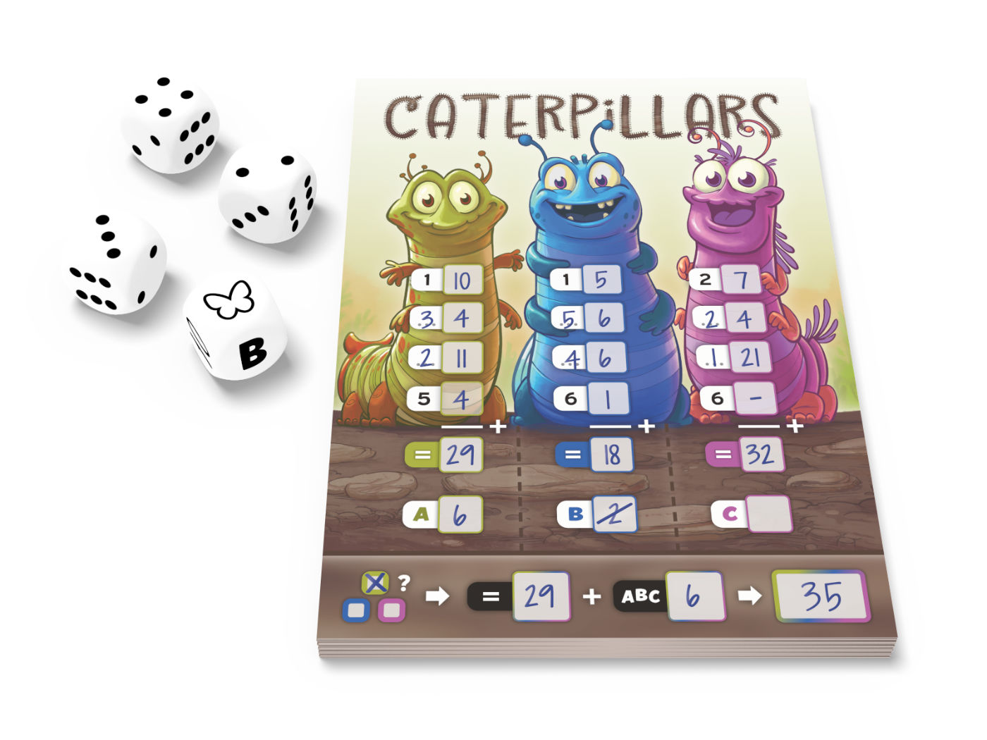 Caterpillars is een eenvoudig dobbelspel waarbij spelers punten moeten toekennen aan hun drie rupsen. Uiteindelijk vallen de rups met de laagste en hoogste score af en bepaalt de middelste rups de eindscore.